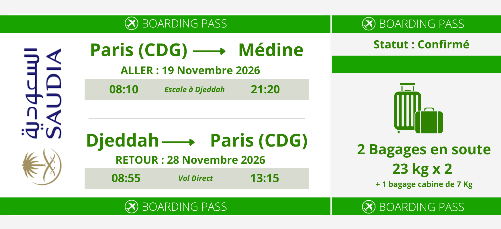 Rendez-vous à l’aéroport pour prendre votre vol à destination de Médine. Procédez à votre enregistrement, Il est nécessaire que vous souhaitez à l’aéroport 3 heures avant l’embarquement.