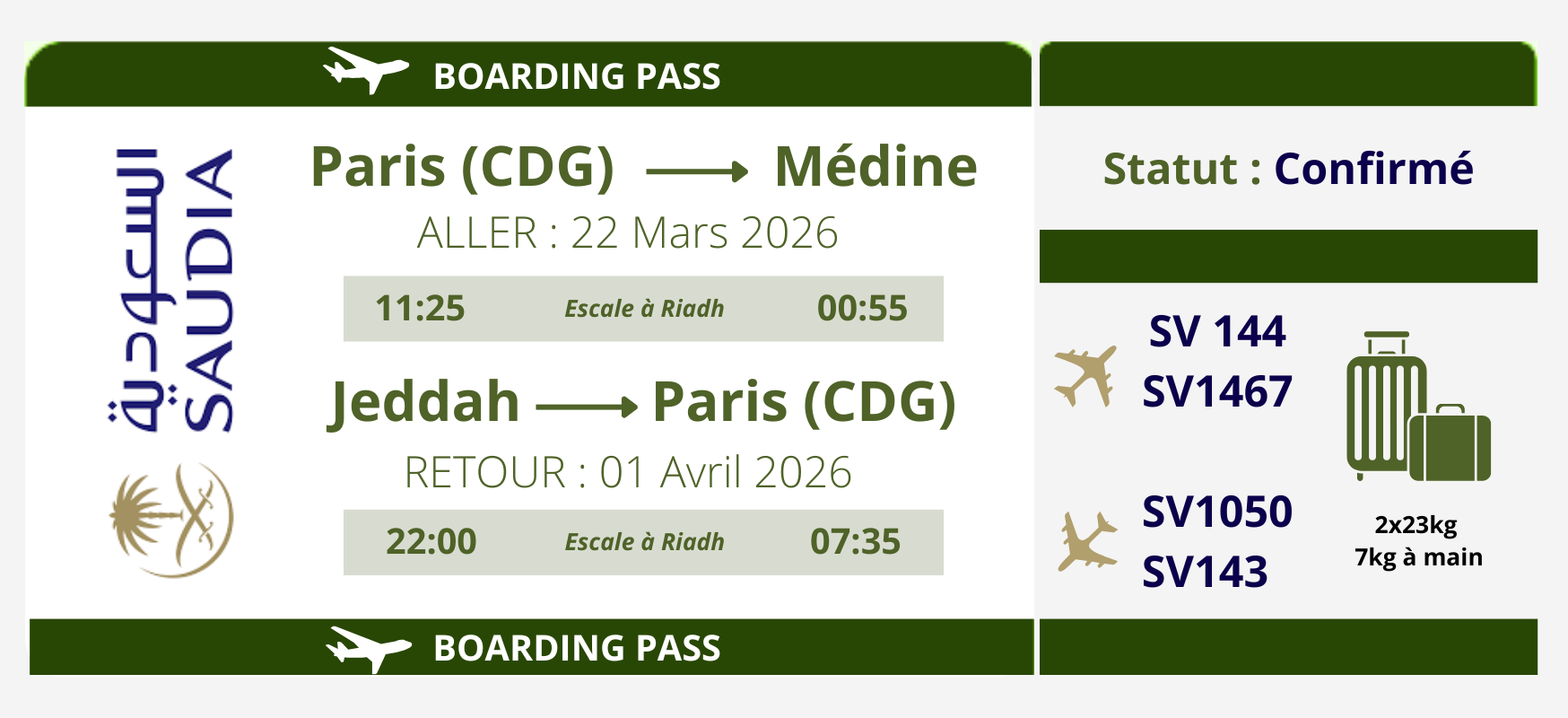 Rendez-vous à l’aéroport pour prendre votre vol à destination de Médine. Procédez à votre enregistrement, Il est nécessaire que vous souhaitez à l’aéroport 3 heures avant l’embarquement.